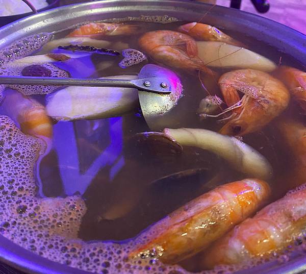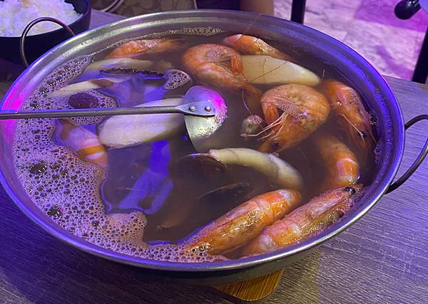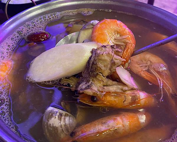 蝦子目測有10隻左右,還有一些茭白筍和枸杞,蛤蠣滿多的,湯頭很像火鍋店藥膳鍋的湯底,真的很好喝!個人私心覺得很滿意,鍋裡的料也不吝嗇給的滿滿的,唯一美中不足的地方就是冷掉會有點微苦,湯泡飯也是不錯的吃法~