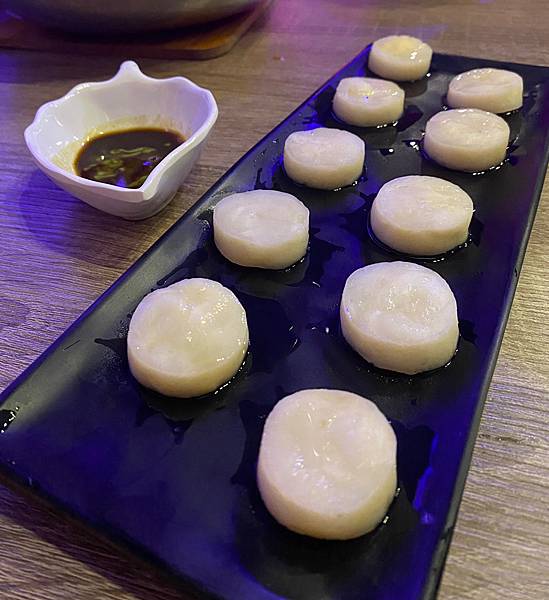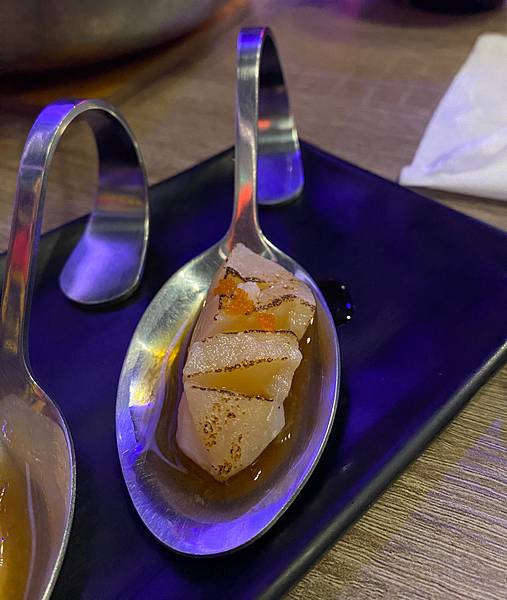 醬汁是酸酸的柴魚湯,但我直接醬料的酸嚇到,不過干貝很鮮美!因為我是整口塞進去的,所以整體口感會偏酸,直接吃干貝的話可以吃到干貝的鮮美和微酸的口感,味道想要重一點的人可以左右兩側再沾一點醬料~