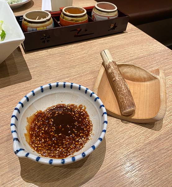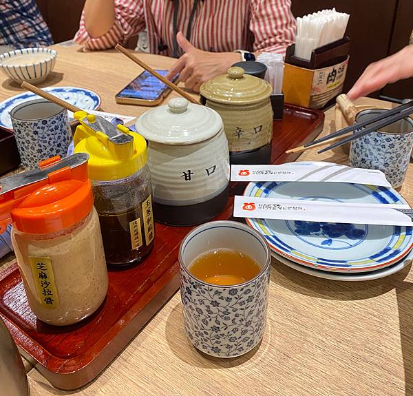 辛口是豬排醬,甘口好像是醬油,玉蔥洋蔥醬蠻鹹的,建議不要加太多,胡麻沙拉醬比較不酸,茶蠻好喝的,溫度是剛好直接入口的溫度