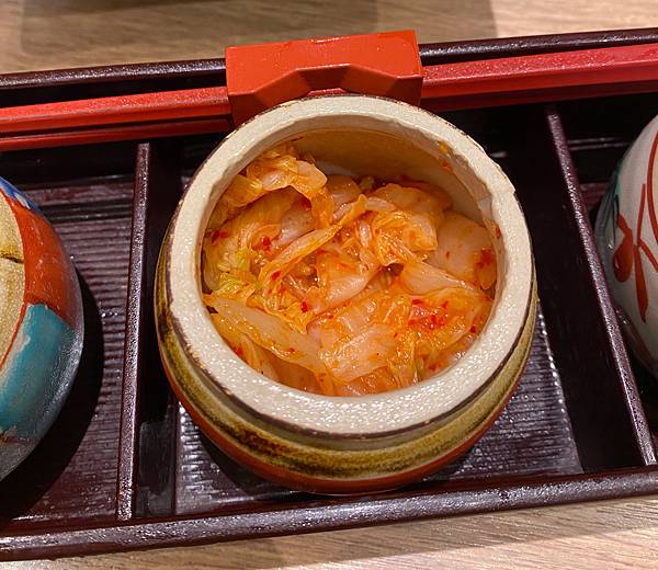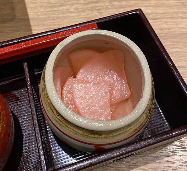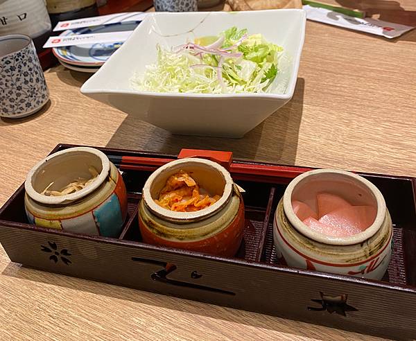 小菜分別是蘿蔔漬 、泡菜和牛蒡絲。