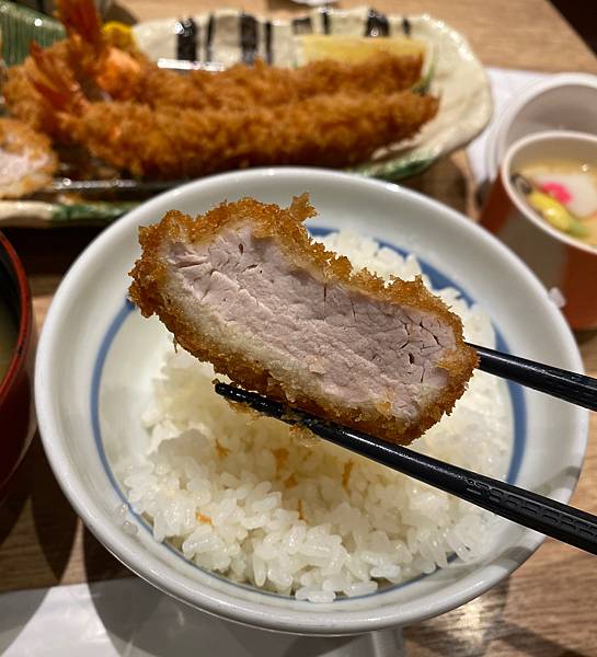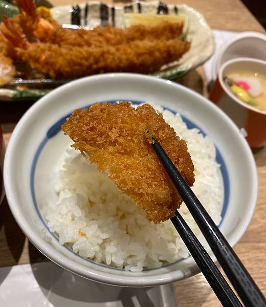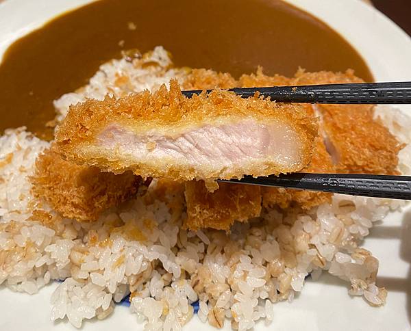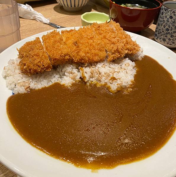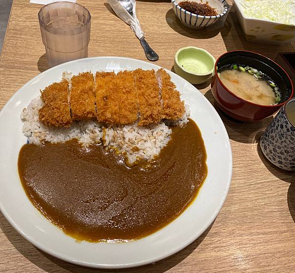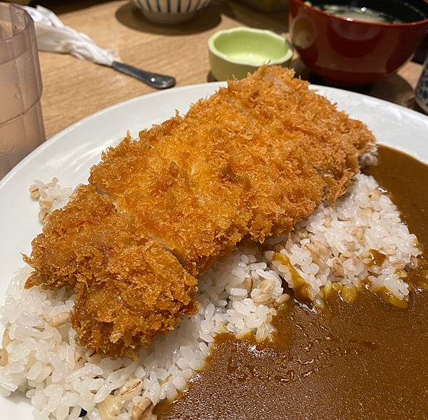 飯可以換成麥飯,套餐附味增湯、小菜和一杯冰水,蠻困惑冰水的用途,咖哩的話不會辣但有一個特殊的味道,個人沒有到很喜歡,里肌的部分水分比腰內多,所以吃起來很多汁,一點都不會柴。